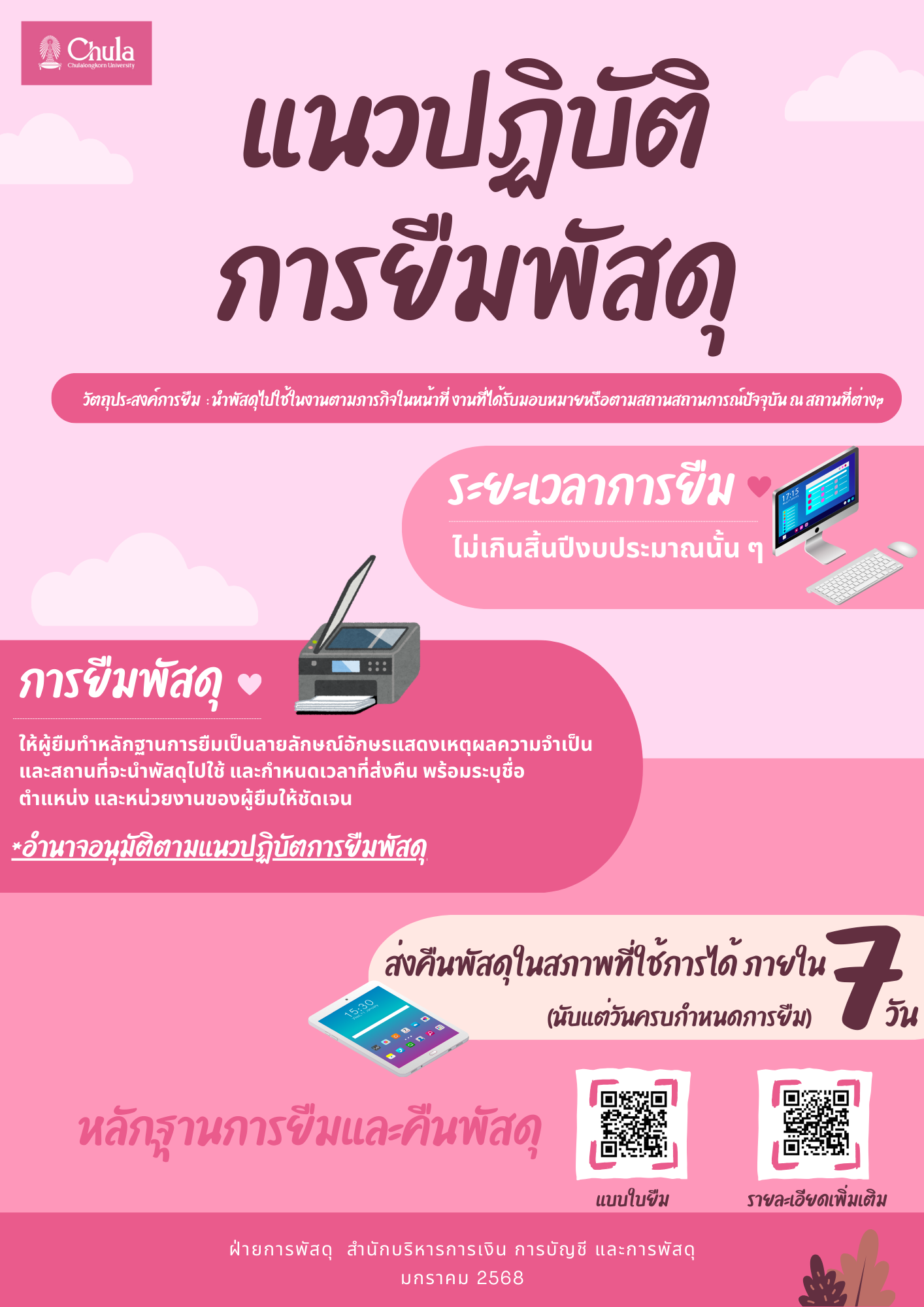 ให้ผู้ยืมทำหลักฐานการยืมเป็นลายลักษณ์อักษรแสดงเหตุผลความจำเป็นและสถานที่จะนำพัสดุไปใช้ และกำหนดเวลาที่ส่งคืน พร้อมระบุชื่อ ตำแหน่ง และหน่วยงานของผู้ยืมให้ชัดเจน