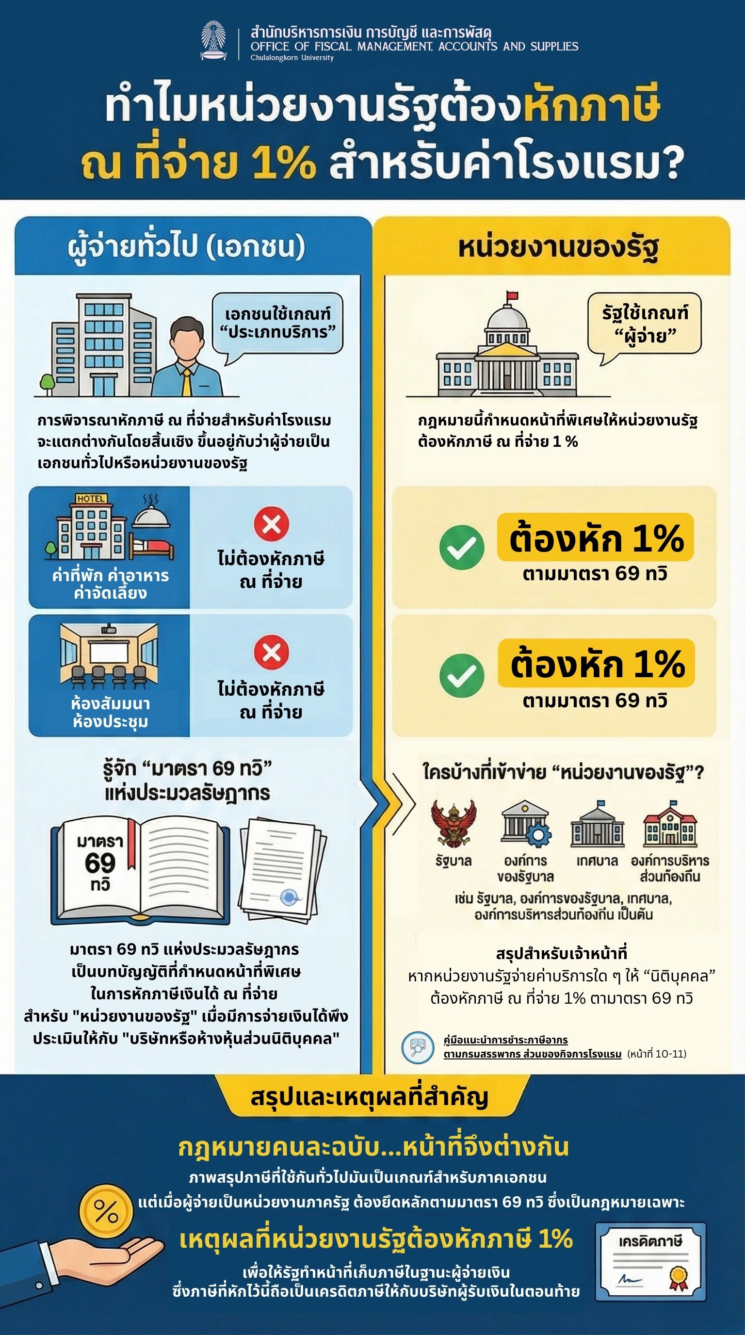 ดังนั้น แม้ว่าค่าใช้จ่ายดังกล่าวอาจไม่เข้าหลักเกณฑ์การหักภาษีของเอกชนทั่วไป แต่เมื่อผู้จ่ายเป็นหน่วยงานของรัฐ จึงมีหน้าที่ต้องหักภาษี 1% ตามกฎหมายเฉพาะนี้