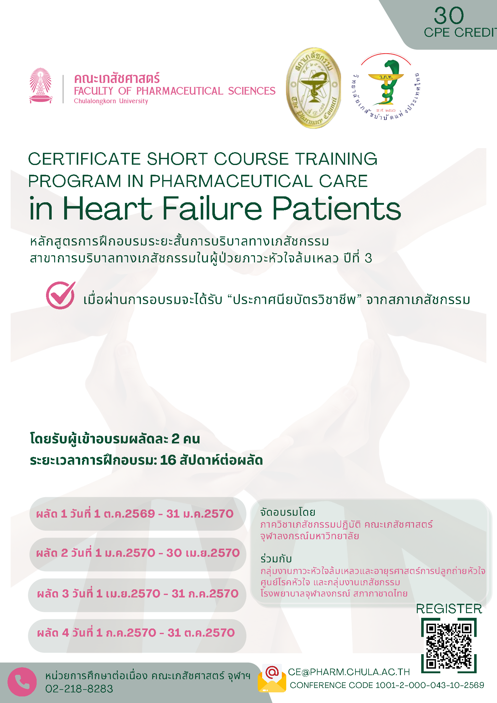 1) ภาคทฤษฎี จำนวน 2 หน่วยกิต คิดเป็นการบรรยาย 30 ชั่วโมง (โดยจะได้ CPE จำนวน 30 หน่วย) ณ ภาควิชาเภสัชกรรมปฏิบัติ คณะเภสัชศาสตร์ จุฬาลงกรณ์มหาวิทยาลัย